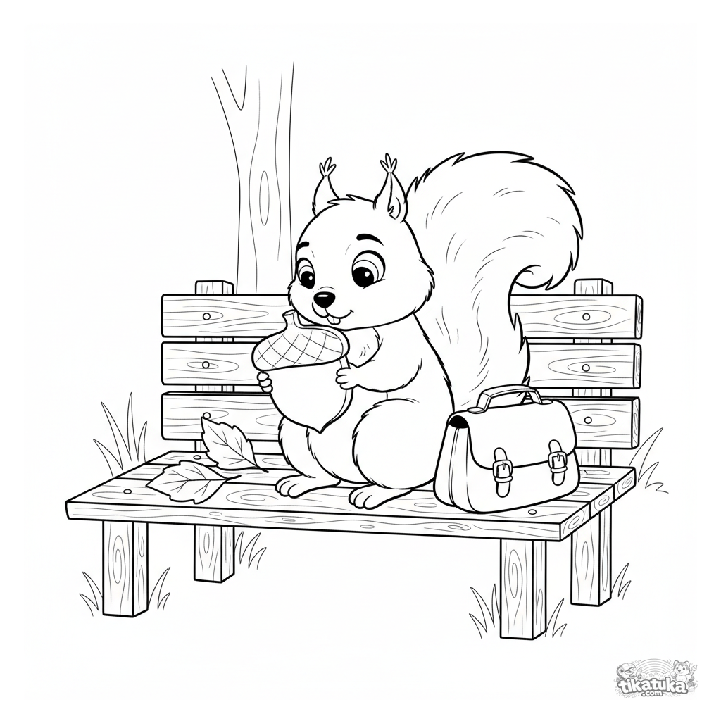 Раскраска для детей 7-9 лет: белка, сидящая на скамейке в городском парке, разгадывает деревянный пазл в форме желудя. Осенние листья вокруг.