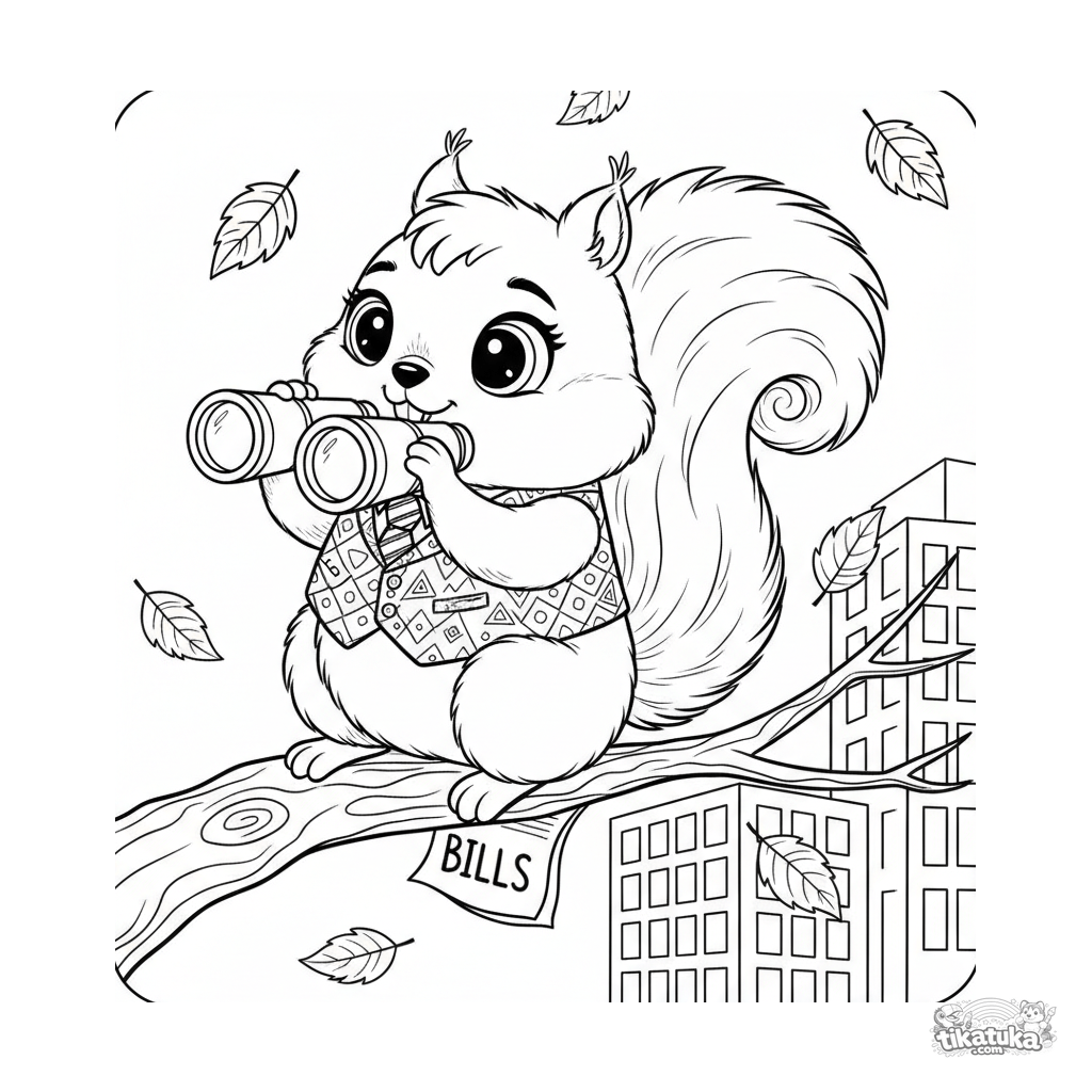 Раскраска для детей 10-12 лет: белка в жилете с биноклем на ветке высматривает день зарплаты у офисного здания. Смешная интернет-сцена с деталями.
