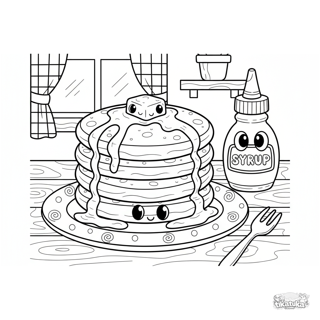 Раскраска еды для детей 4-6 лет. Высокая стопка пушистых блинов на тарелке с капающим сиропом и тающим кусочком масла на кухонном столе.