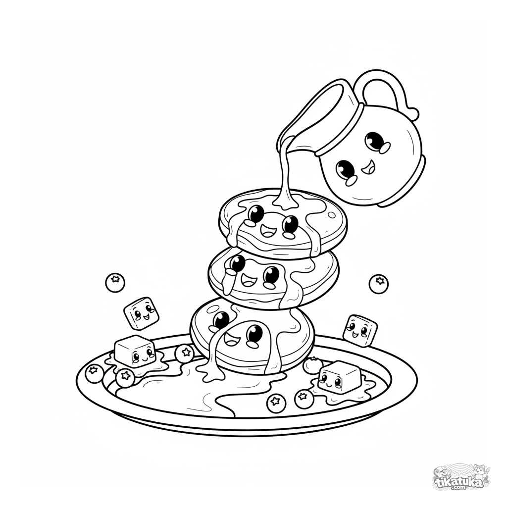 Простая раскраска для малышей 2-3 лет. Весёлая стопка блинов с лицами катается с сиропной горки на тарелке с ягодами и маслом.