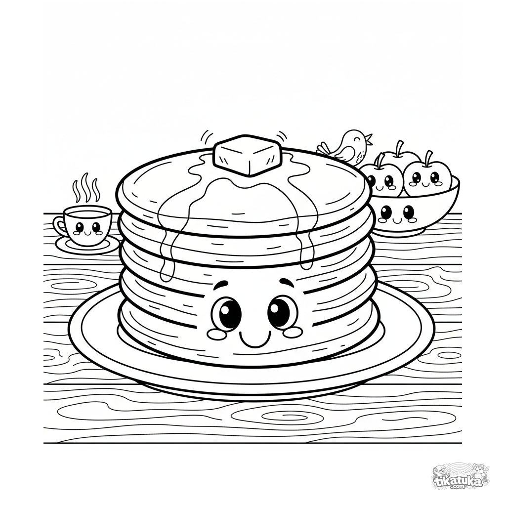 Раскраска для детей 4-6 лет: высокая стопка воздушных блинов с тающим кусочком масла и сиропом. Простая тарелка, деревянный стол, аппетитная сцена.
