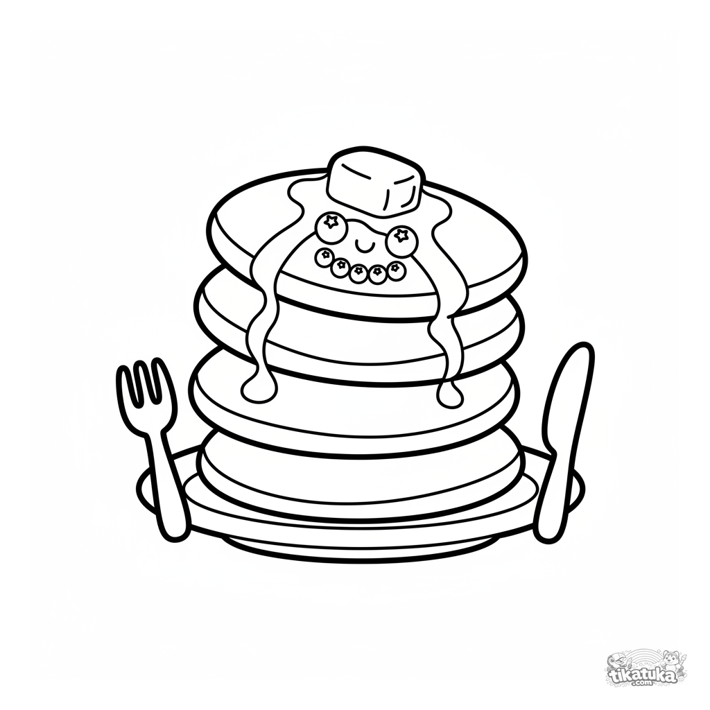 Веселая раскраска для самых маленьких: стопка блинчиков с улыбающейся рожицей. Огромные простые формы идеально подходят для малышей 2-3 лет.