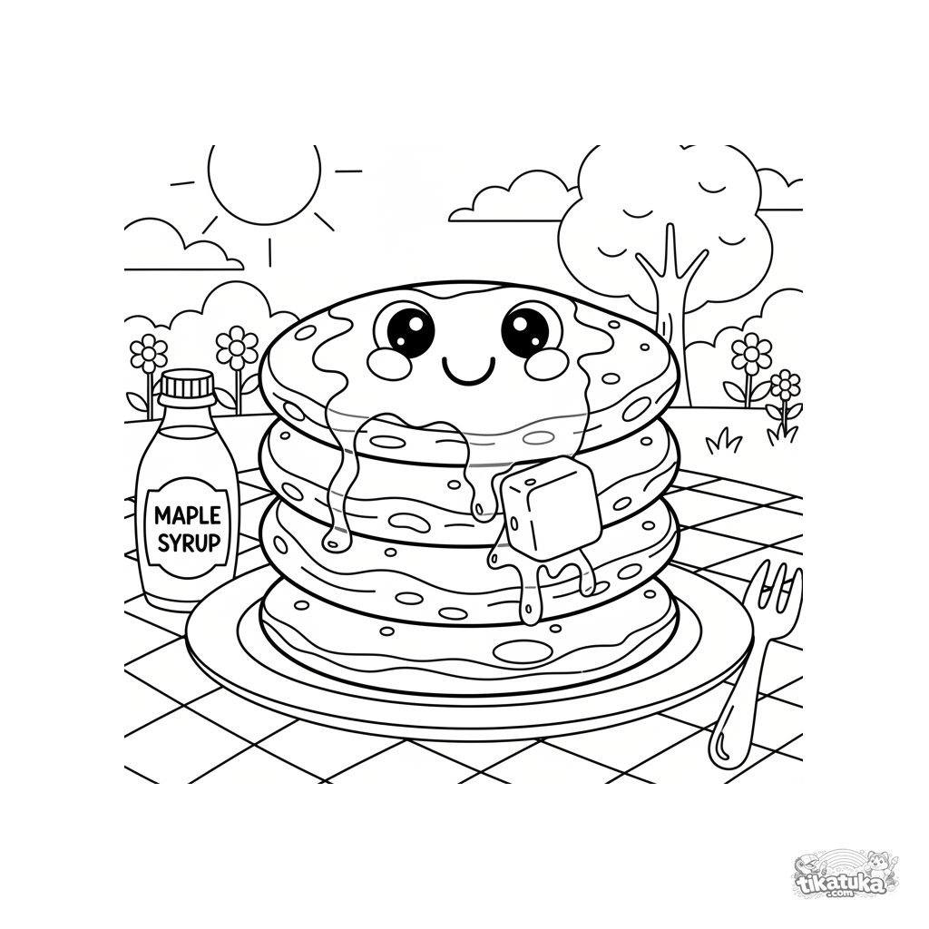 Раскраска для детей 4-6 лет: высокая стопка пушистых блинов с весёлым лицом из ягод стоит на тарелке на клетчатом пледе во дворе.