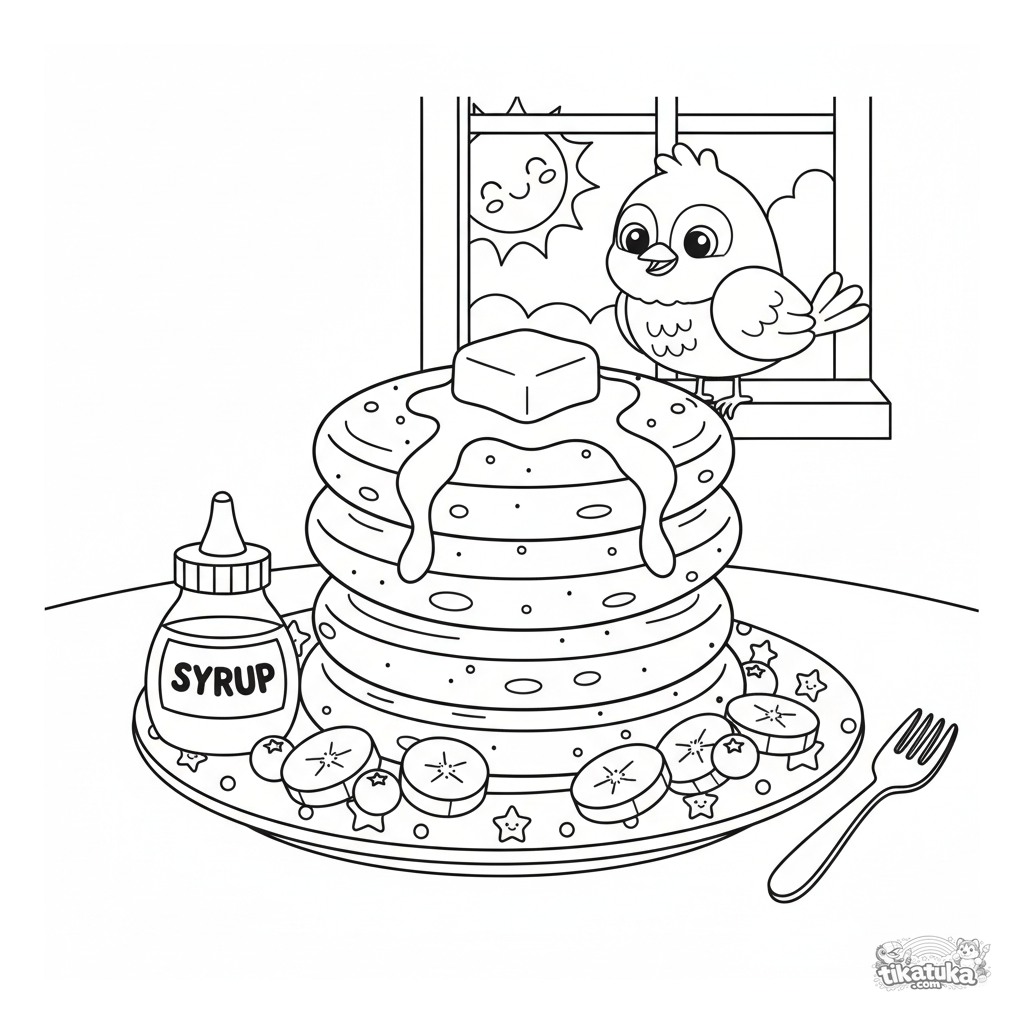 Раскраска с едой для детей 4-6 лет. Изображена высокая стопка воздушных блинов с тающей масляной лепешкой, фруктами и сиропом на тарелке.