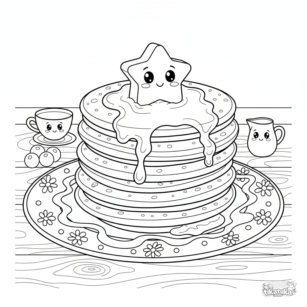 Раскраска для детей 4-6 лет. Аппетитная стопка блинов с вкусной начинкой на тарелке. Веселая и простая сцена с едой для раскрашивания.