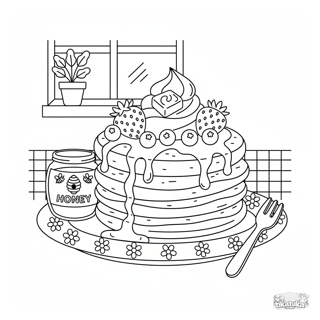 Раскраска для детей 4-6 лет: аппетитная стопка блинов со взбитыми сливками, ягодами и сиропом. Веселая мультяшная сцена.