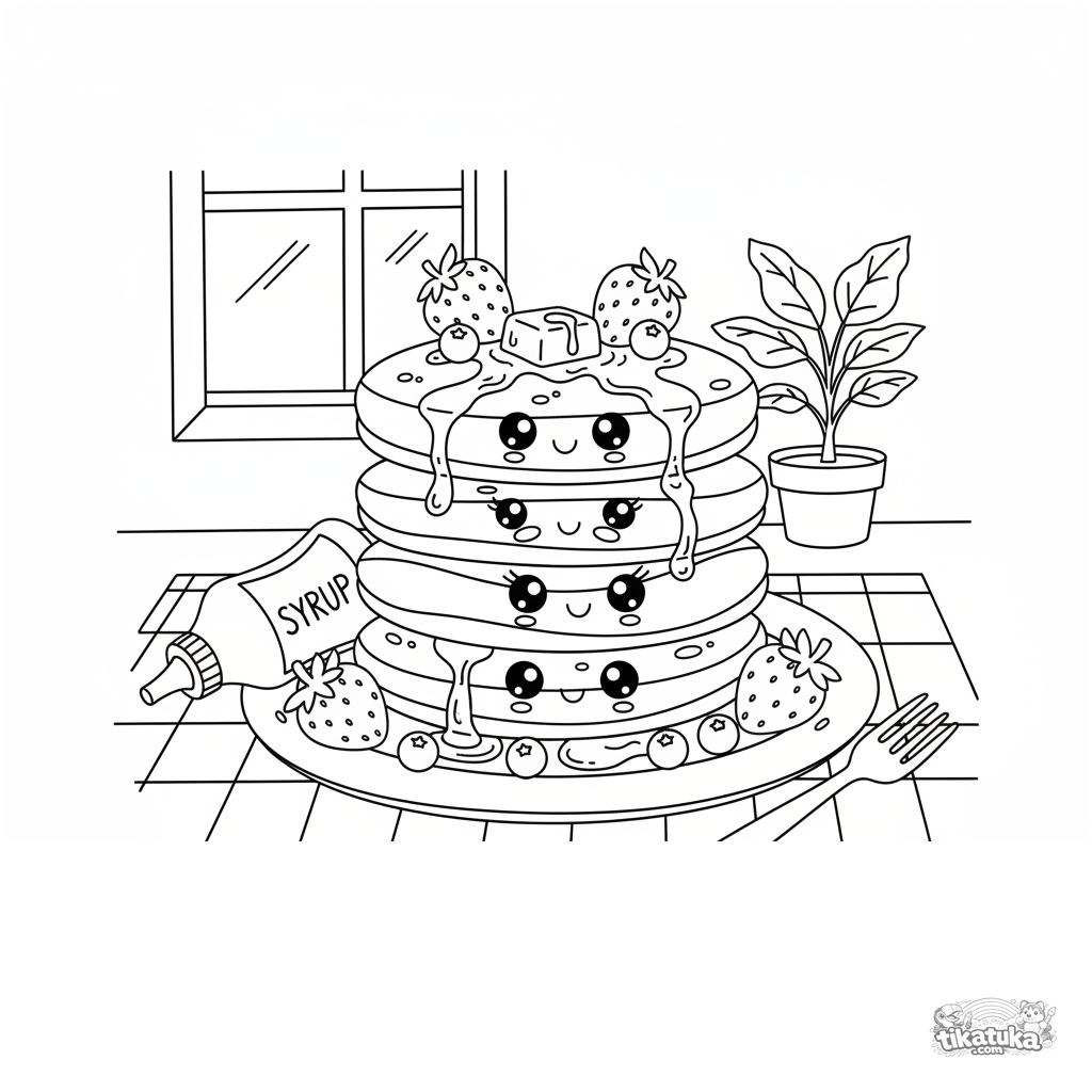 Раскраска с веселой стопкой блинчиков. Для детей 4-6 лет. Изображена высокая стопка блинов с лицами, ягодами и сиропом на тарелке с клетчатой скатертью.