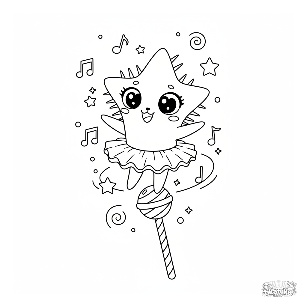 Раскраска для детей 7-9 лет: звёздчатый микроб в пачке танцует на верхушке леденца. Лёгкая, изящная сцена с нотами и блёстками.