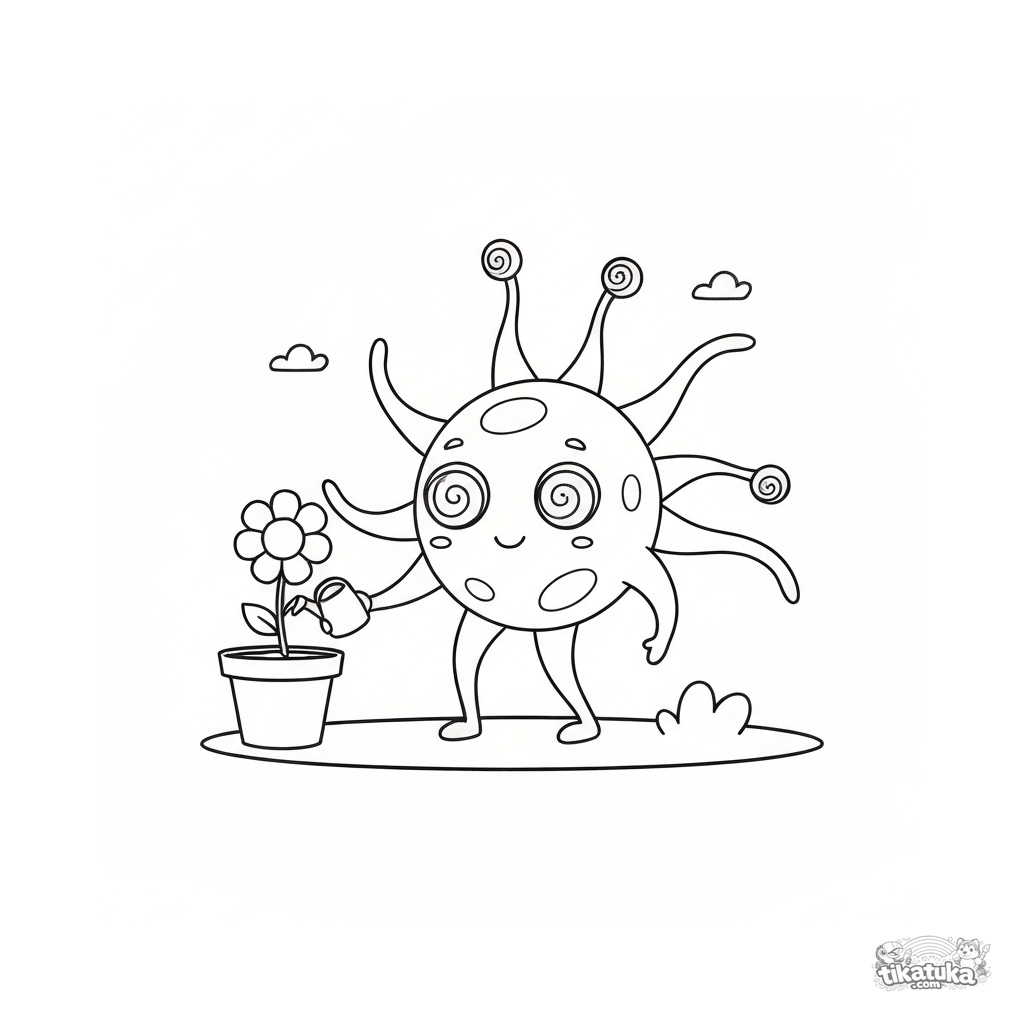 Раскраска для детей 5-8 лет. Забавный микроб-звёздочка с волнистыми жгутиками поливает цветок в горшке. Милый ретро стиль с широкими полями. Скачать бесплатно.