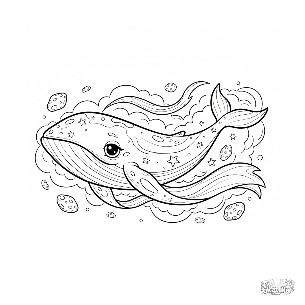 Раскраска для детей 7-9 лет: огромный звездный кит плывет сквозь красочную туманность. Сцена в стиле акварельного скетча для творческого раскрашивания.