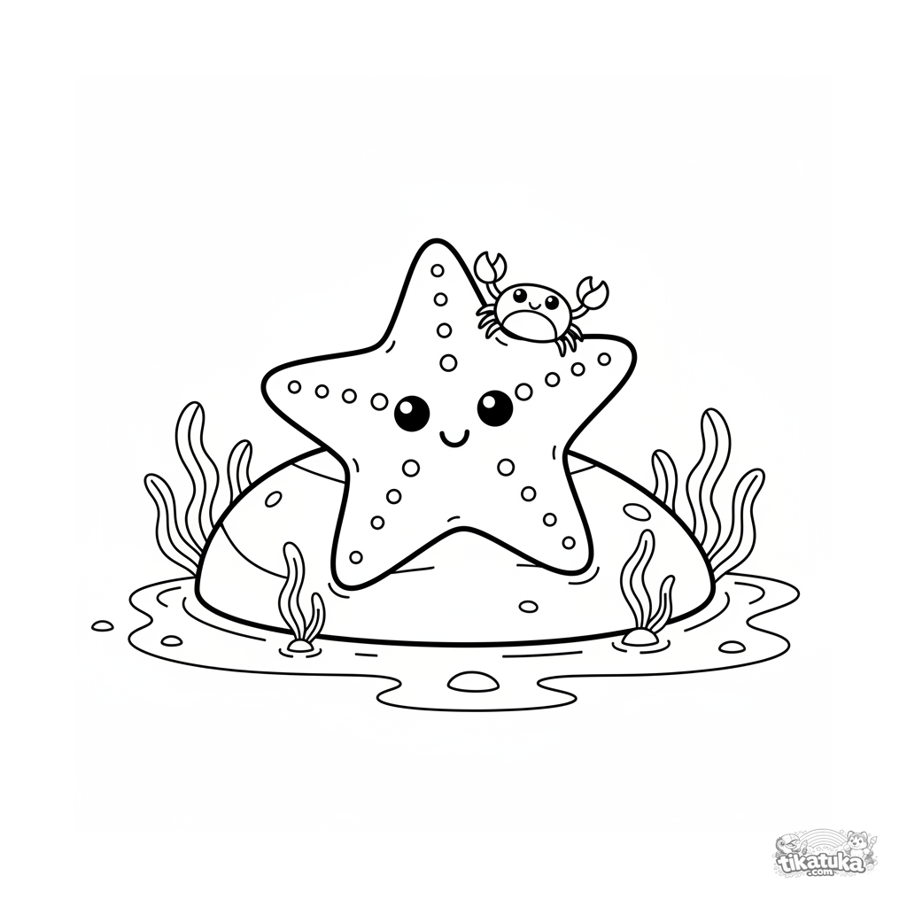 Очень простая раскраска для малышей 2-3 лет: морская звезда и крабик на камне в луже после отлива. Огромные фигуры, минимум деталей, максимум свободного места для закрашивания.