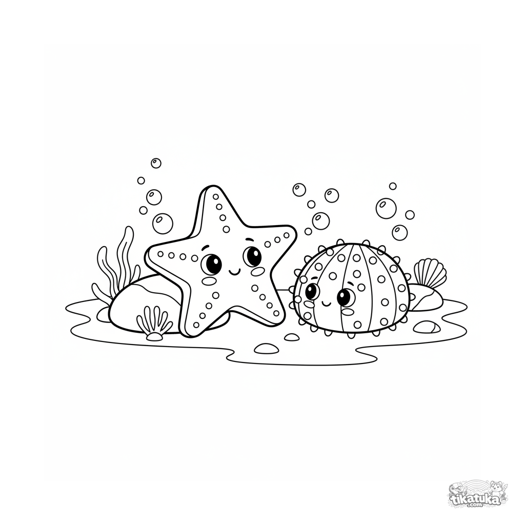 Раскраска для детей 4-6 лет: дружелюбная морская звезда и колючий морской ёж беседуют на камне в солнечной луже на мелководье.