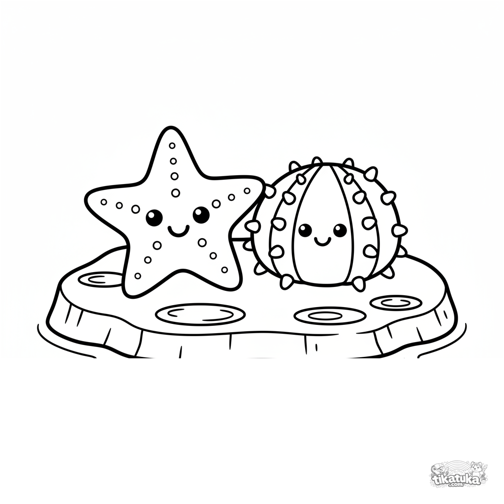 Простая раскраска для самых маленьких: морская звезда и ёжик сидят на камне в солнечной луже. Для детей 2-3 лет. Геометричные формы, как деревянные игрушки.