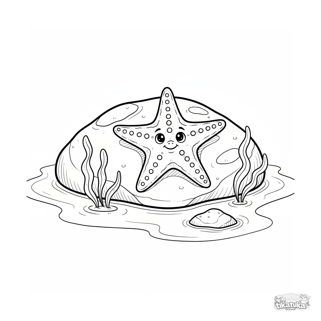 Раскраска с морской звездой, отдыхающей на камне в солнечной приливной луже на мелководье. Для детей 7-9 лет, с текстурными деталями и широкими полями.