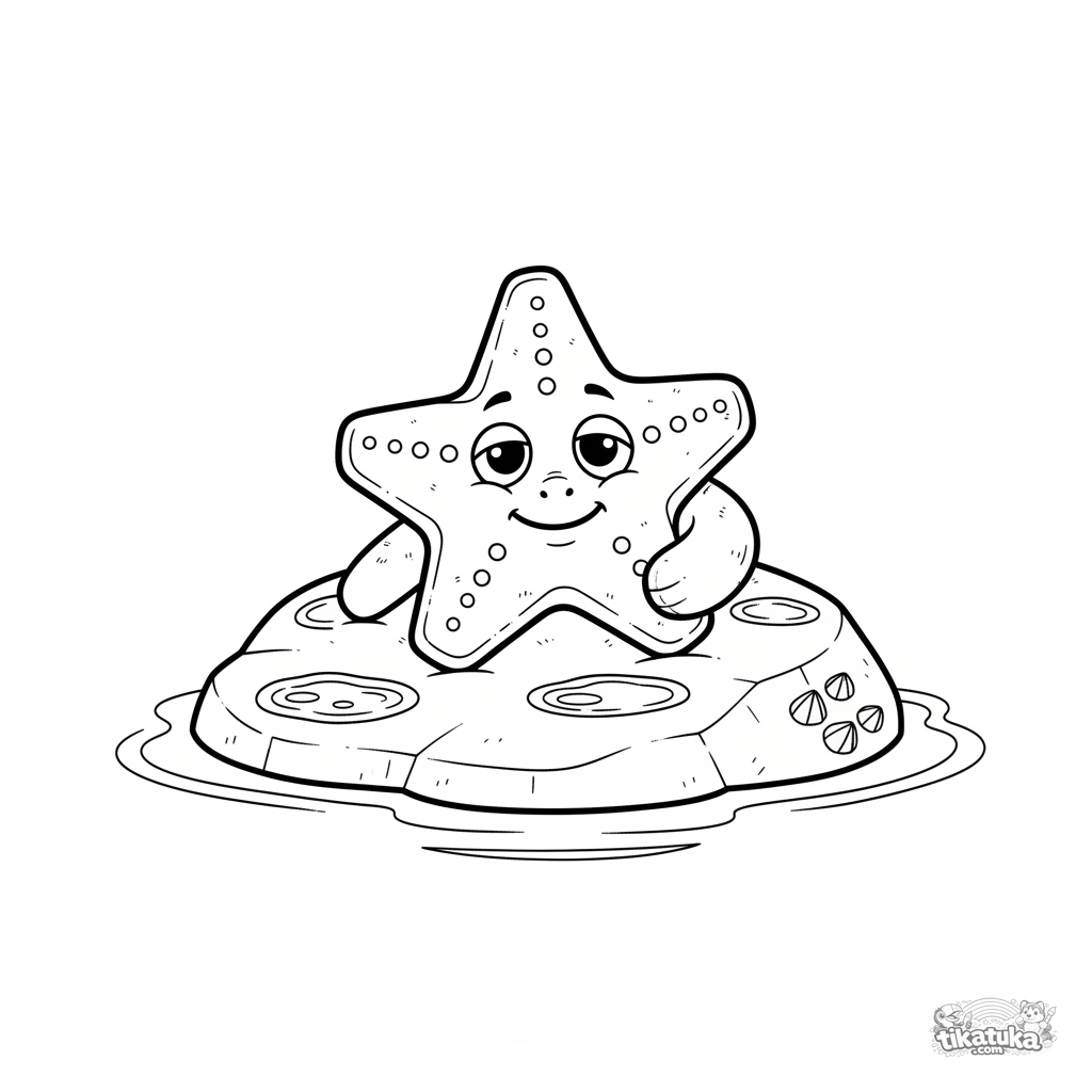 Раскраска с уютной морской звездой, отдыхающей на прогретом солнцем камне в мелкой луже. Для детей 4-6 лет. Простые, мягкие формы.