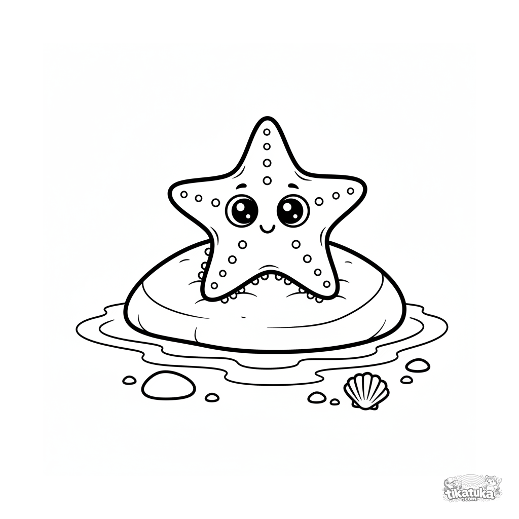 Раскраска с морской звездой, греющейся на теплом камне в самой мелкой воде под солнцем. Простая композиция с четкими формами для детей 4-6 лет.