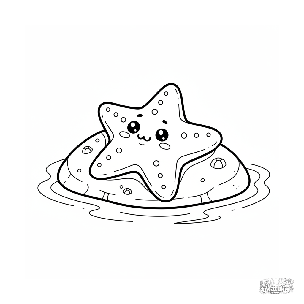 Раскраска с милой морской звездой, греющейся на тёплом камне в солнечном мелководье. Для детей 4-6 лет, милый дизайн.