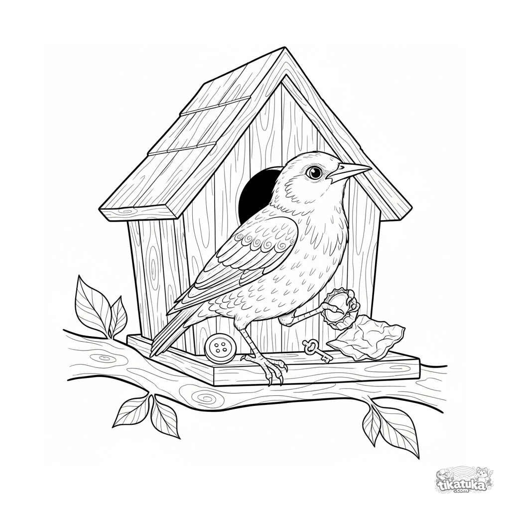 Детализированная раскраска для детей 10-12 лет: скворец украшает вход в деревянный скворечник блестящими предметами - пробкой, пуговицей, фольгой. Реалистичный стиль.