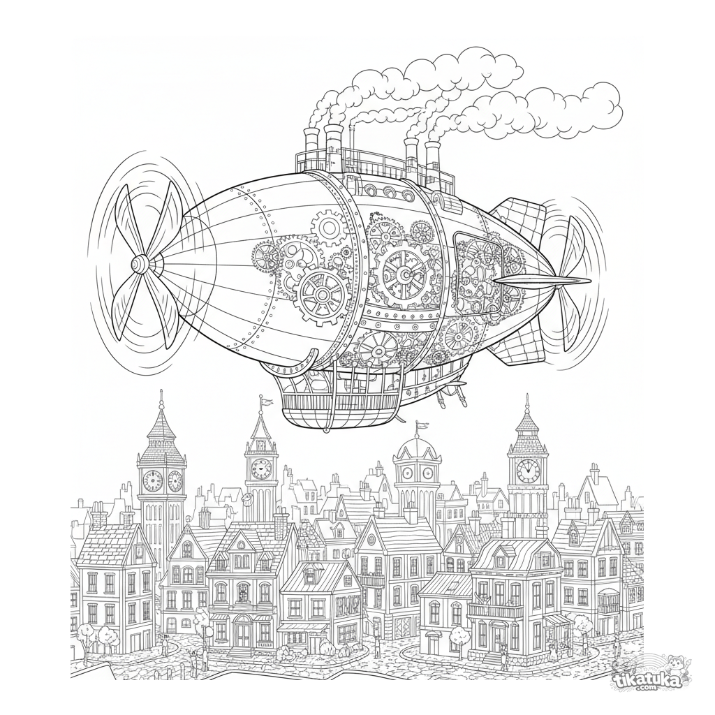 Раскраска с детализированным паровым дирижаблем в стиле стимпанк, летящим над викторианским городом. Для детей 8-12 лет. Сложная и увлекательная сцена с механизмами.