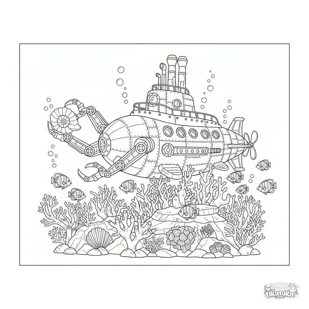 Раскраска с детализированным паровым подводным аппаратом, исследующим коралловый риф. Для детей от 8 лет. Сложный уровень с множеством деталей.