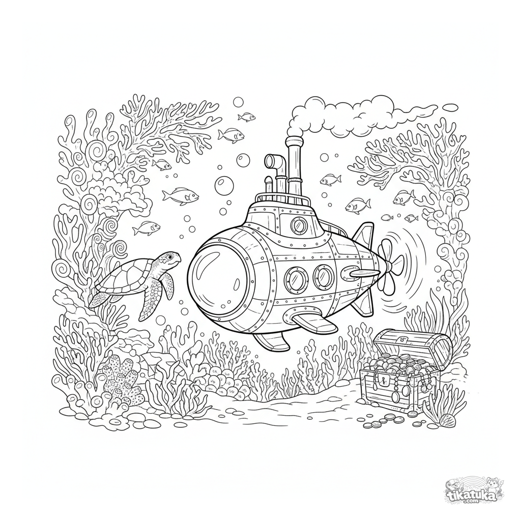 Сложная раскраска транспортного средства: детализированная паровая подводная лодка исследует коралловый риф. Для детей 8-12 лет. Сцена с черепахой, кораллами и сундуком.