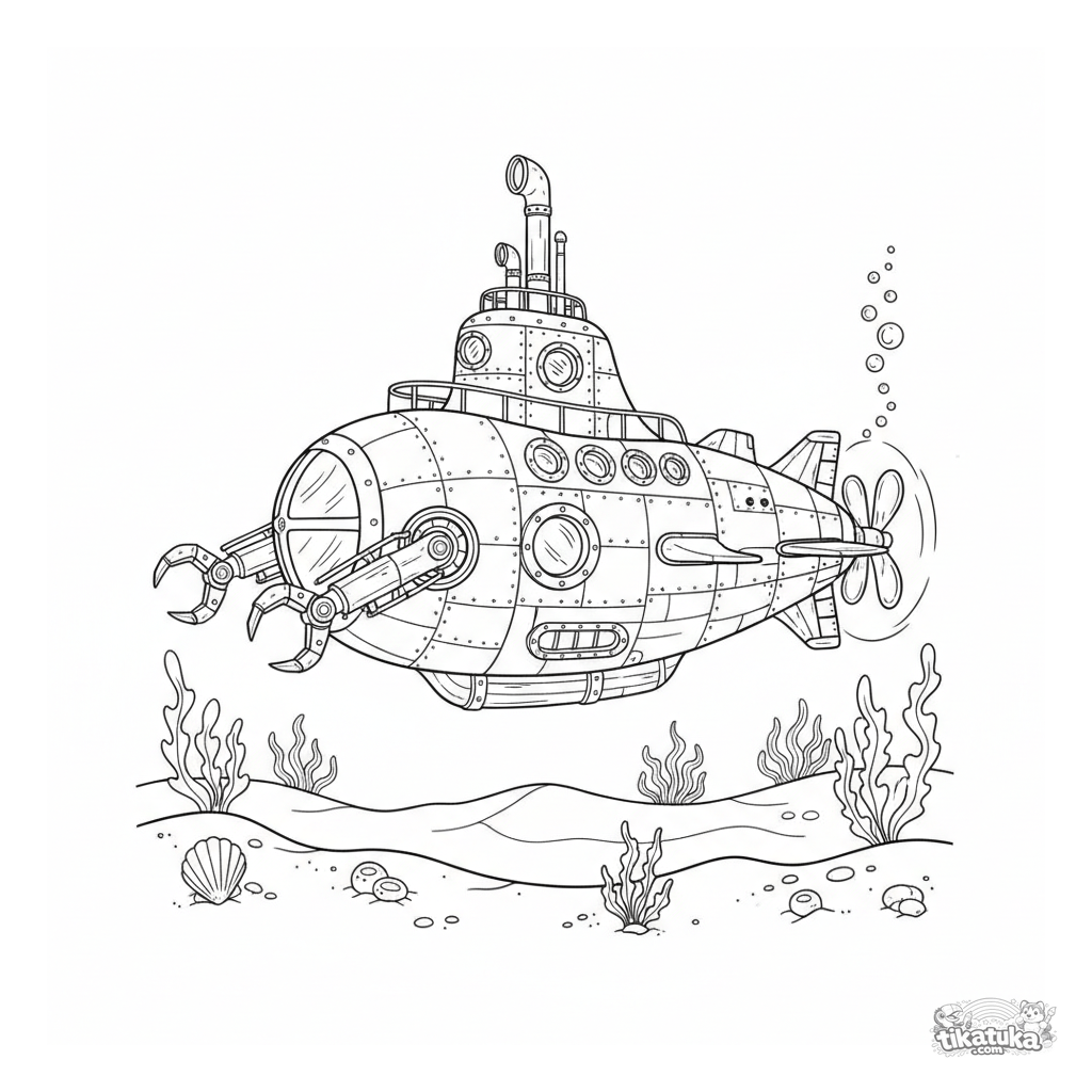 Сложная реалистичная раскраска парового подводного аппарата в океане. Для детей 8-12 лет. Детализированный корпус, иллюминаторы и механические руки.