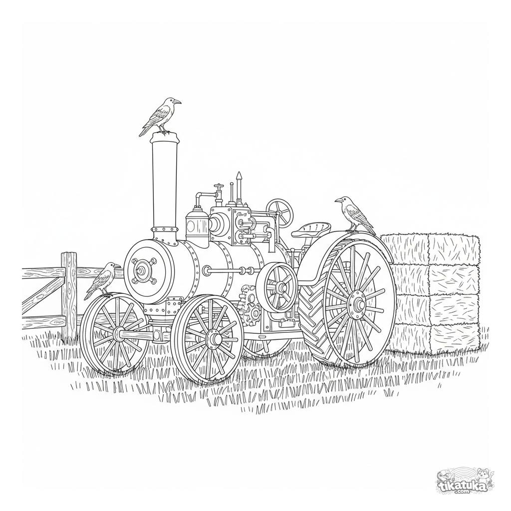 Сложная раскраска детализированного парового трактора в поле. Для детей 8-12 лет. Деревянные колеса, стог сена, вороны. Полный транспорт, широкие поля.