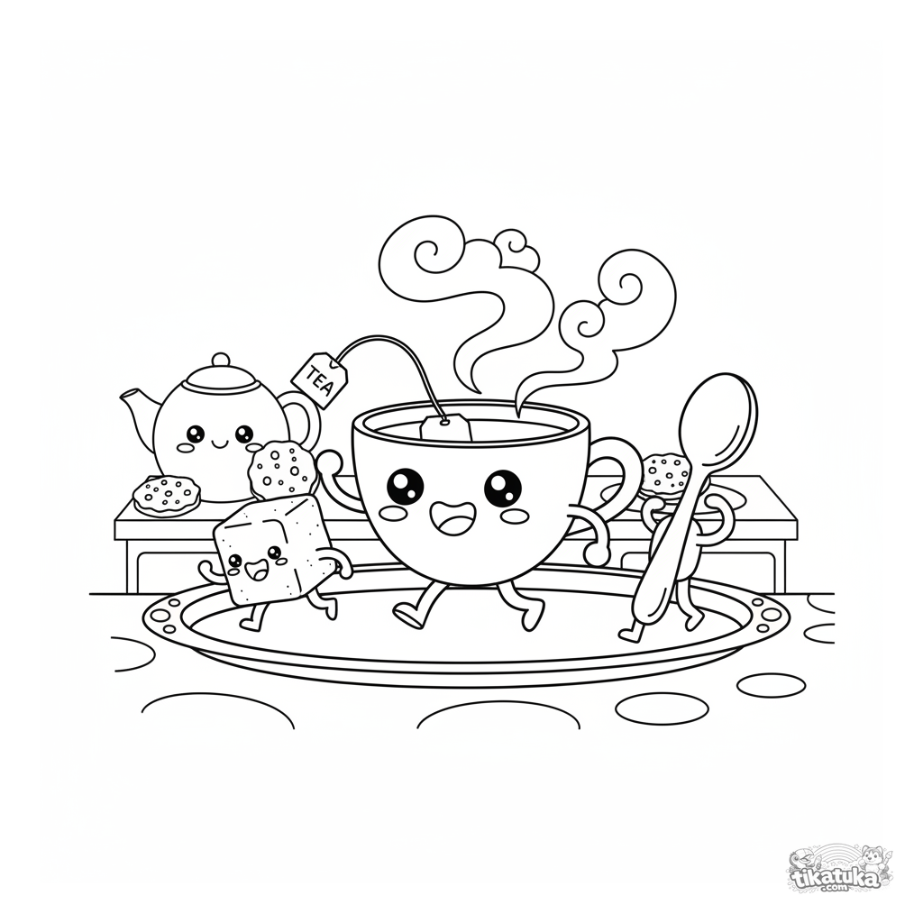 Раскраска с чашкой чая, марширующей по чайному подносу. Для детей 4-6 лет. Изображены ярлык от пакетика, кубик сахара, ложка и завитки пара.