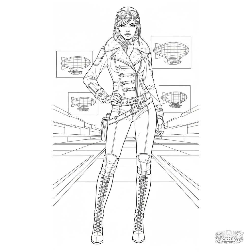 Сложная раскраска для возраста 10-12 лет: модель в стимпанк-куртке на футуристическом подиуме. Детализированные механические элементы, аксессуары и фон с голограммами.