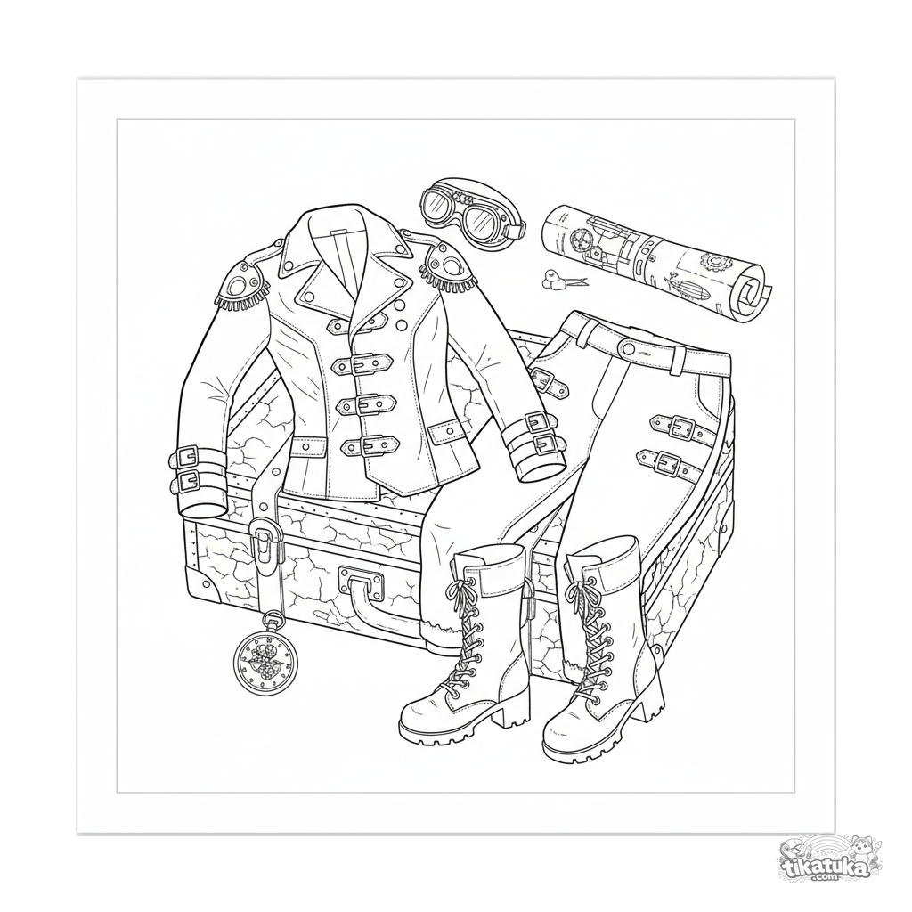 Сложная раскраска для детей 10-12 лет: детализированный стимпанк-наряд авиатора разложен на сундуке. Включает кожаную куртку, гетры, очки, чертёж и старинные инструменты.