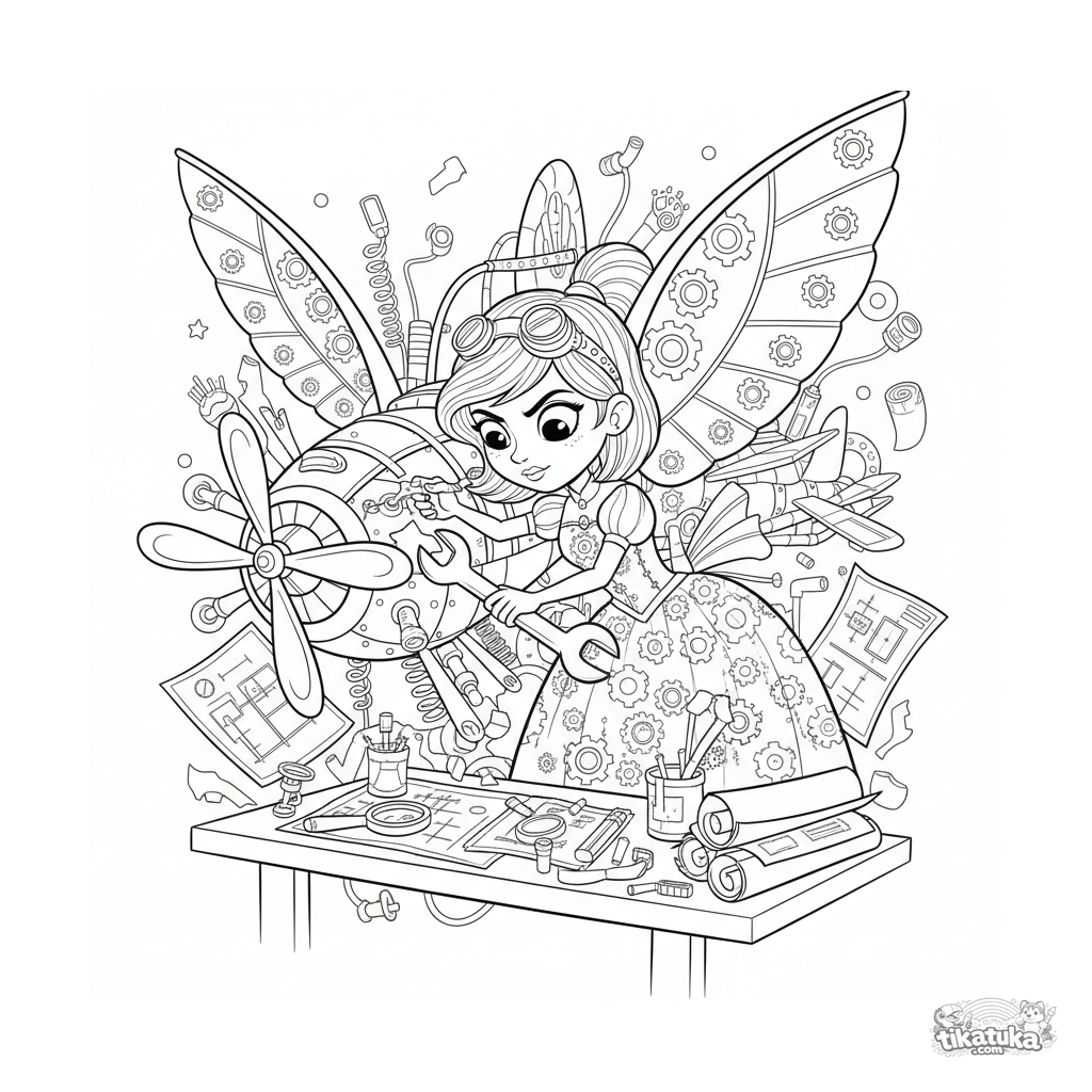 Раскраска для детей 10-12 лет: стимпанк принцесса в мастерской чинит летательный аппарат. Детализированная сцена с инструментами и чертежами.