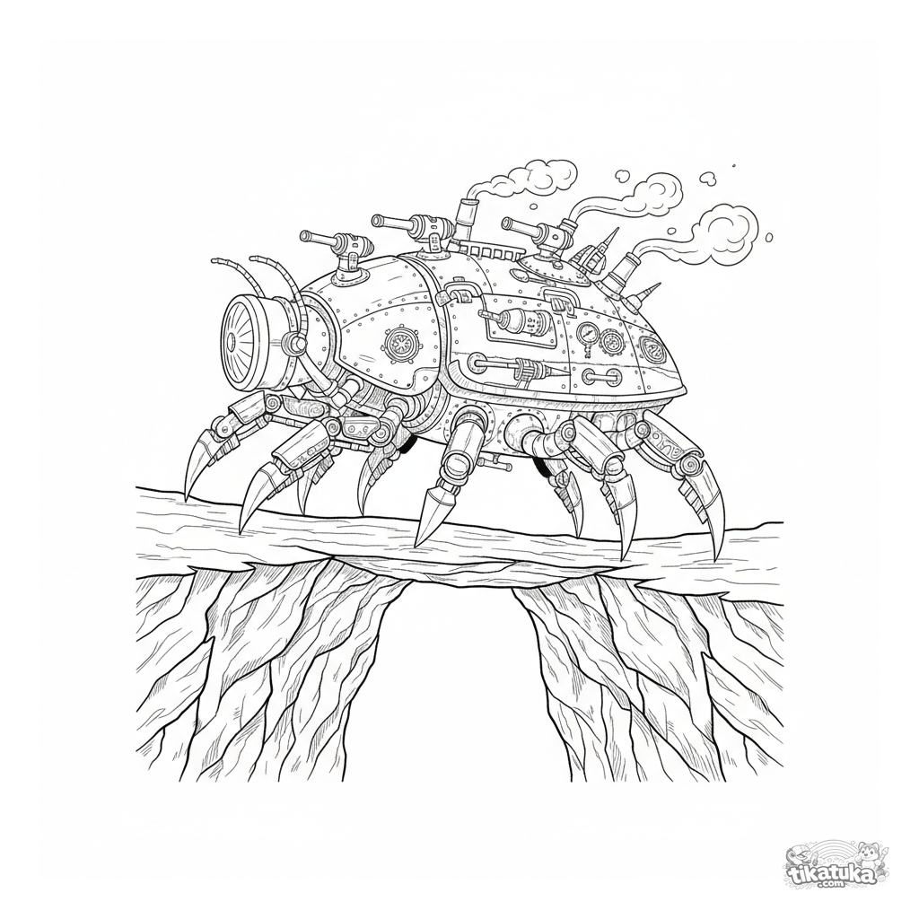 Сложная раскраска для детей 7-12 лет: детализированный стимпанк танк на поршневых ногах пересекает скалистый каньон. Высокая детализация механизмов, реалистичный стиль.