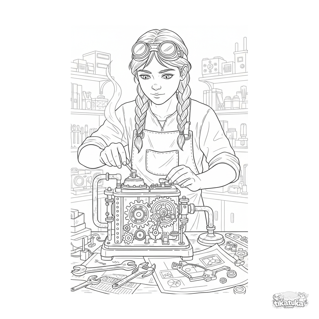 Раскраска для детей 10-12 лет: изобретатель в стиле стимпанк настраивает сложное латунное устройство в подвальной мастерской. Множество деталей: чертежи, инструменты, шестерёнки и пар.