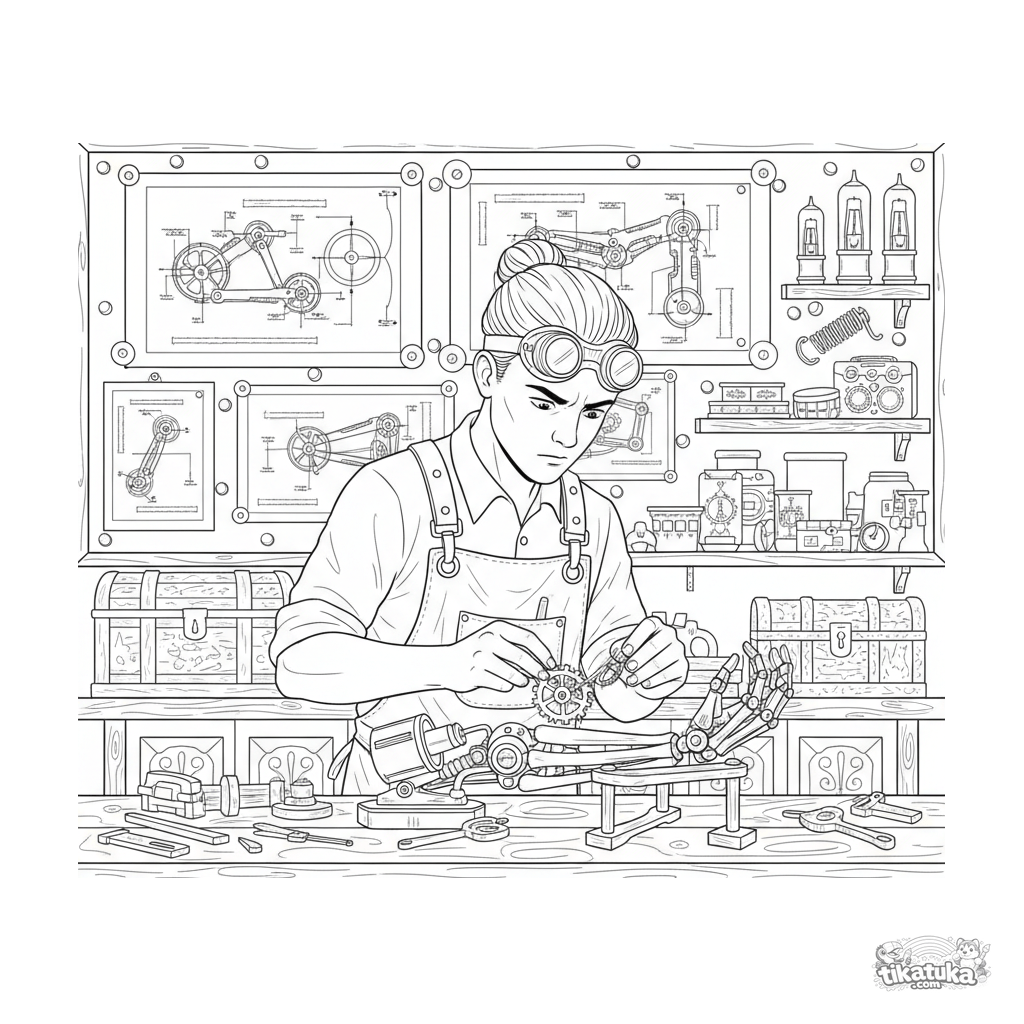 Раскраска для детей 10-12 лет: изобретатель в стиле стимпанк в подвале собирает сложную бионическую руку. Очень детализированная сцена с чертежами, шестерёнками и инструментами.