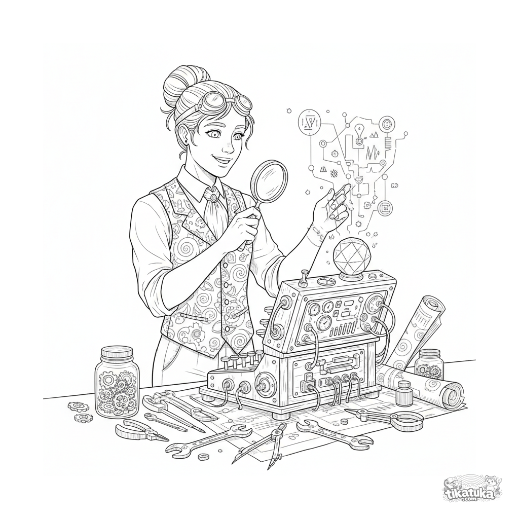 Раскраска для детей 10-12 лет: стимпанк-изобретатель в подвале создает фантастический кибер-дек из латуни и дерева. Детали: чертежи, шестеренки, голограмма. Стиль винтажной гравюры.
