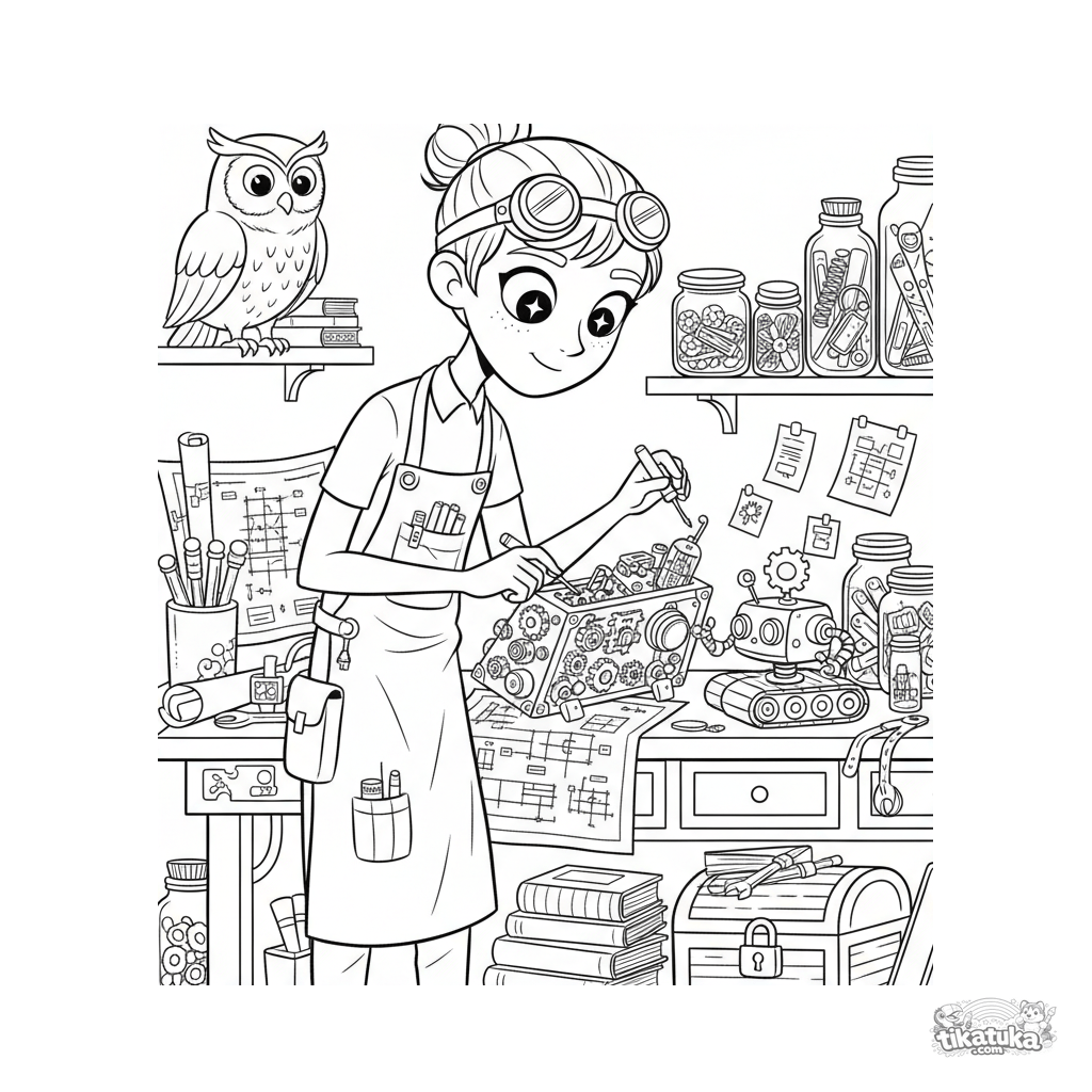 Фантастическая раскраска: стимпанк-изобретатель собирает латунный кибердек в подвальной лаборатории. Множество деталей: шестерни, трубки, инструменты. Для 10-12 лет.