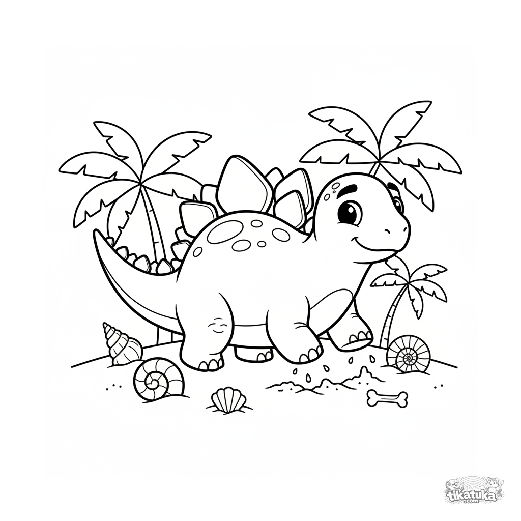 Раскраска стегозавр ищет ракушки в песчаных дюнах древнего пляжа. Для детей 7-9 лет. Динамичная поза, умеренная детализация.