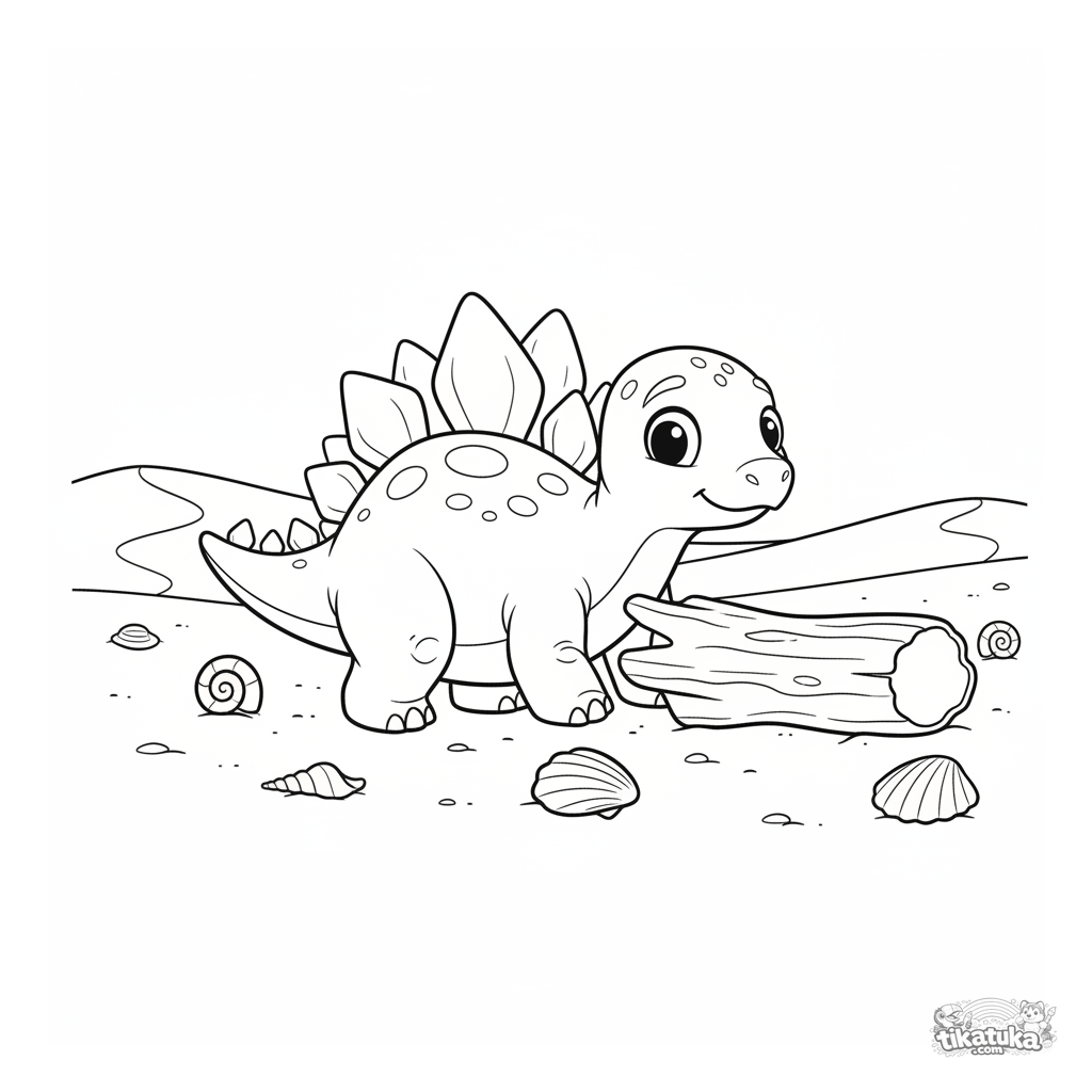 Раскраска для детей 7-9 лет: весёлый стегозавр играет с куском коряги на песчаном пляже древнего океана. Динамичная и забавная сцена.