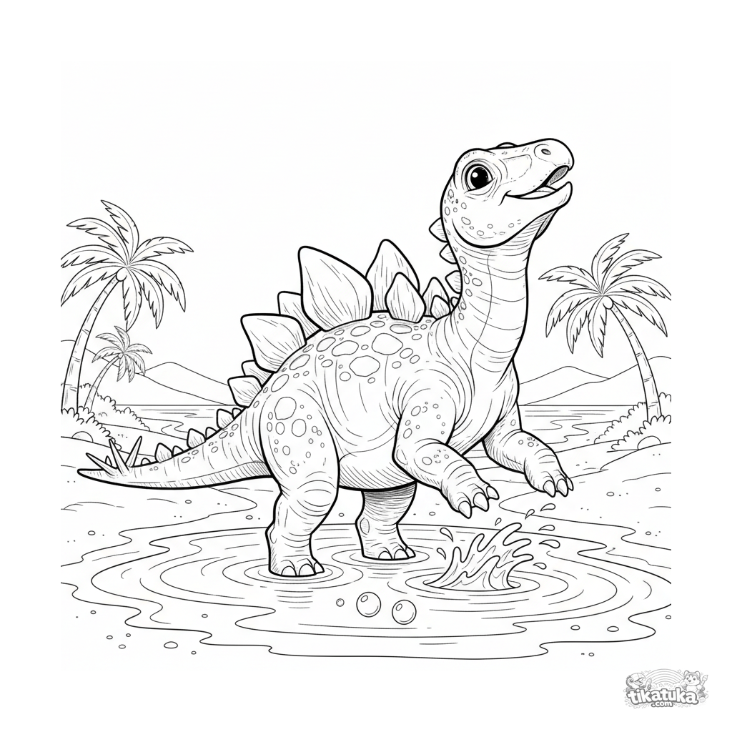 Раскраска для детей 10-12 лет: стегозавр весело плещется в мелкой прибрежной луже на песчаном пляже древнего океана. Детализированное полевое изображение.
