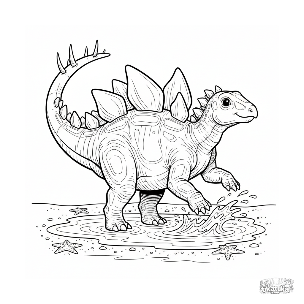 Детальная раскраска для детей 10-12 лет: стегозавр играет в приливном бассейне на пляже древнего океана. Реалистичный стиль с анатомическими деталями.