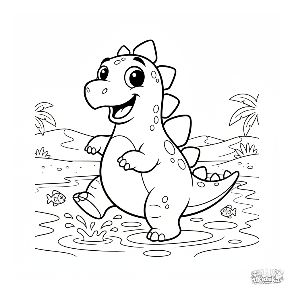 Раскраска для детей 7-9 лет: весёлый стегозавр плещется на мелководье древнего океана. Динамичная и забавная сцена в мультяшном стиле.