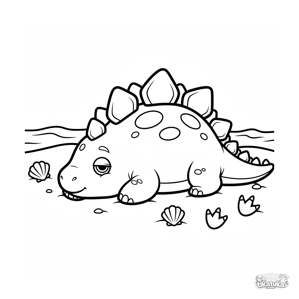 Простая раскраска для малышей 2-3 года: милый стегозавр отдыхает на песчаной дюне у древнего океана. Крупные формы, толстые контуры.