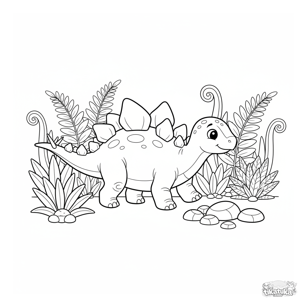 Раскраска для детей 4-6 лет: дружелюбный стегозавр с большими пластинами гуляет среди высоких папоротников в доисторической роще.