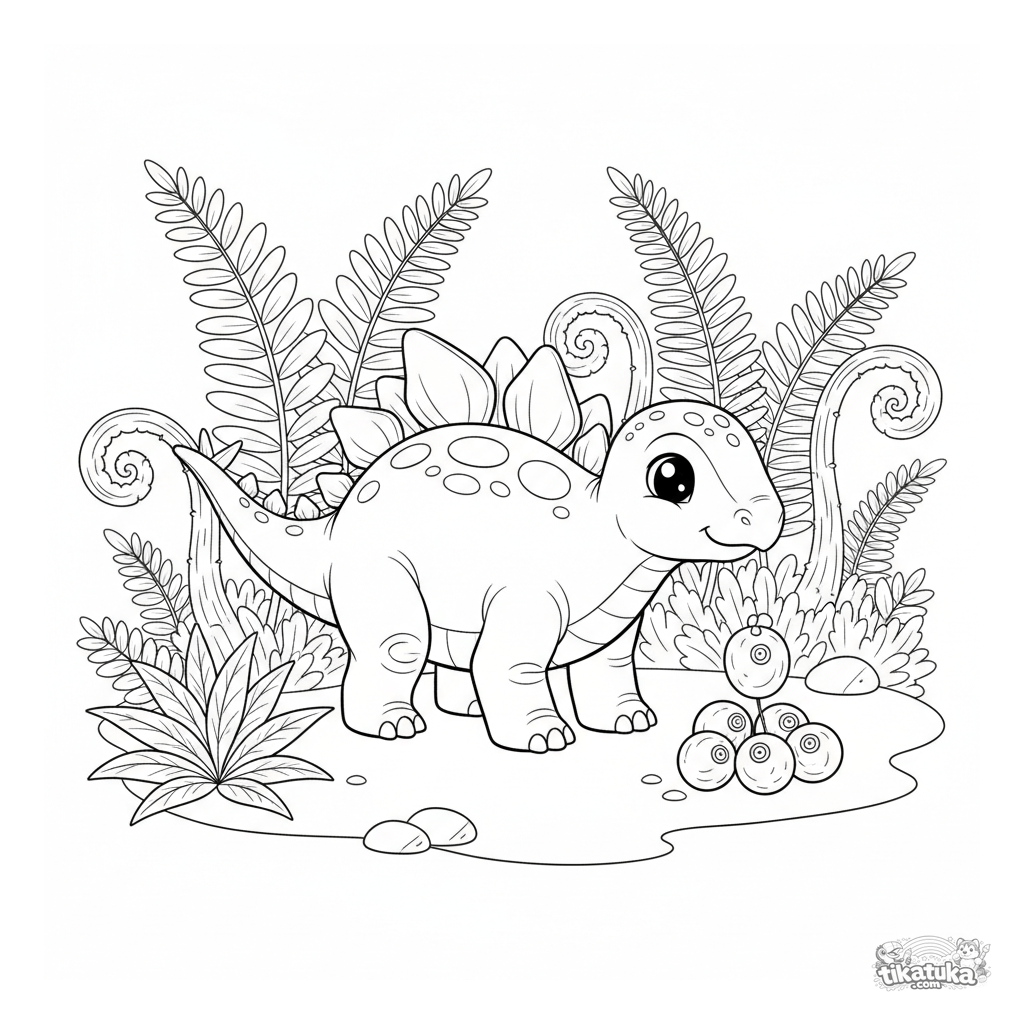 Раскраска для детей 4-6 лет: добродушный стегозавр с пластинами на спине в доисторической роще из папоротников.