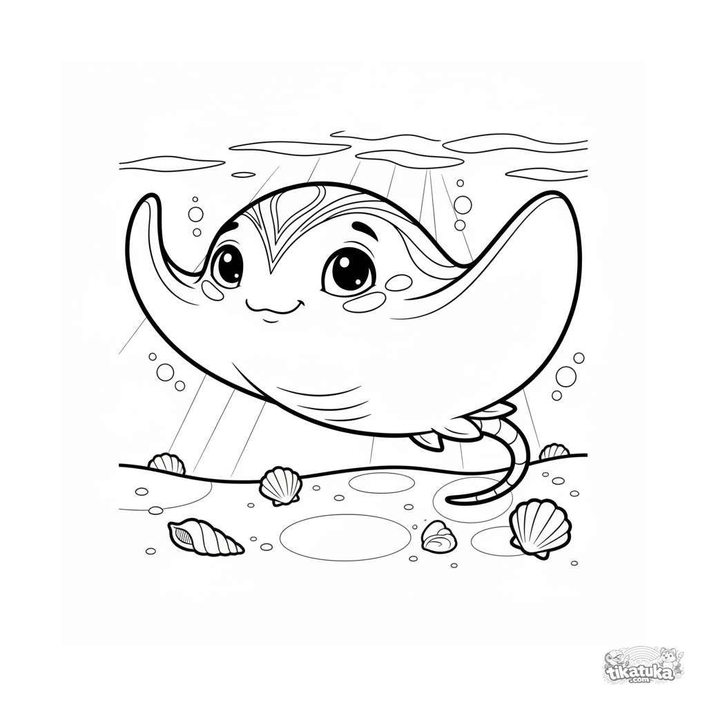 Раскраска для детей 7-9 лет: изящный скат парит над песчаным дном, освещённым солнцем на мелководье. Плавные линии в стиле ар-нуво.