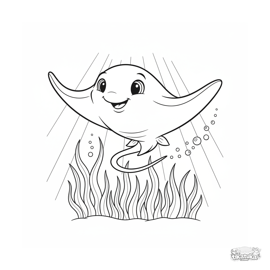 Раскраска для детей 7-9 лет: изящный скат парит над морской травой в лучах солнца на мелководье. Динамичная и красивая сцена.
