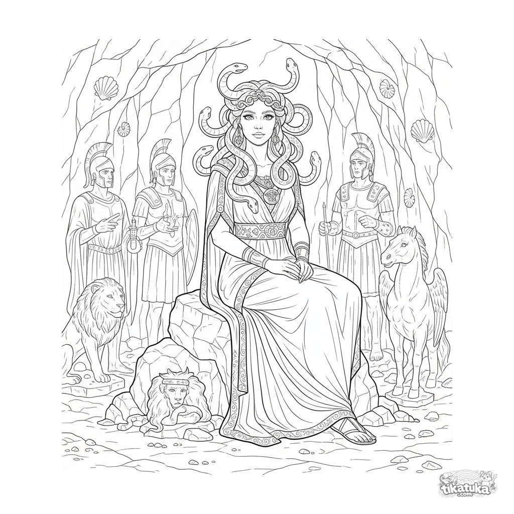 Раскраска: Медуза Горгона в своем каменном логове среди окаменевших статуй. Для детей 10-12 лет. Детализированное изображение пещеры, змей и древних воинов.