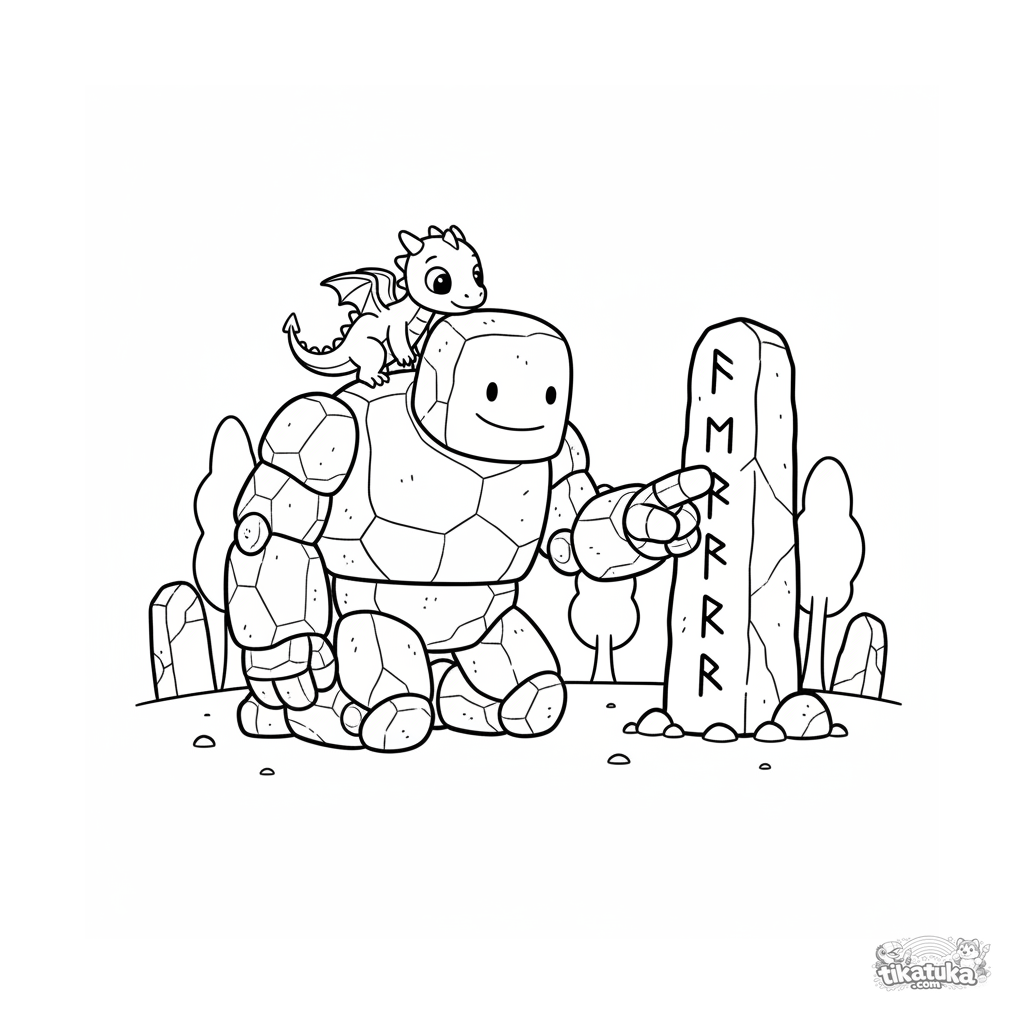 Раскраска с добрым каменным големом, который помогает маленькому дракончику читать древние руны. Для детей 4-6 лет. Сцена дружбы и помощи.