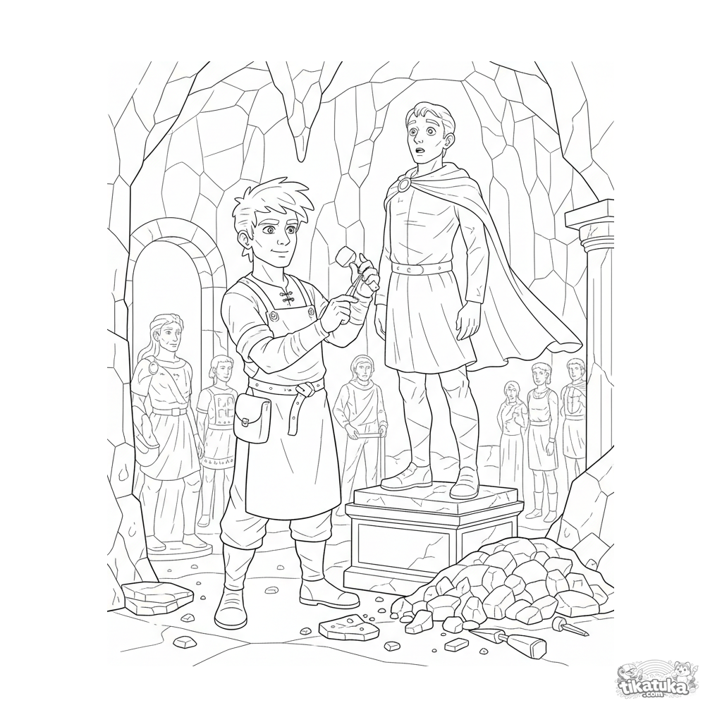 Сложная раскраска для детей 10-12 лет: мифический каменный скульптор за работой в логове Горгоны. Много деталей инструментов и статуй. Стиль реалистичной гравюры.