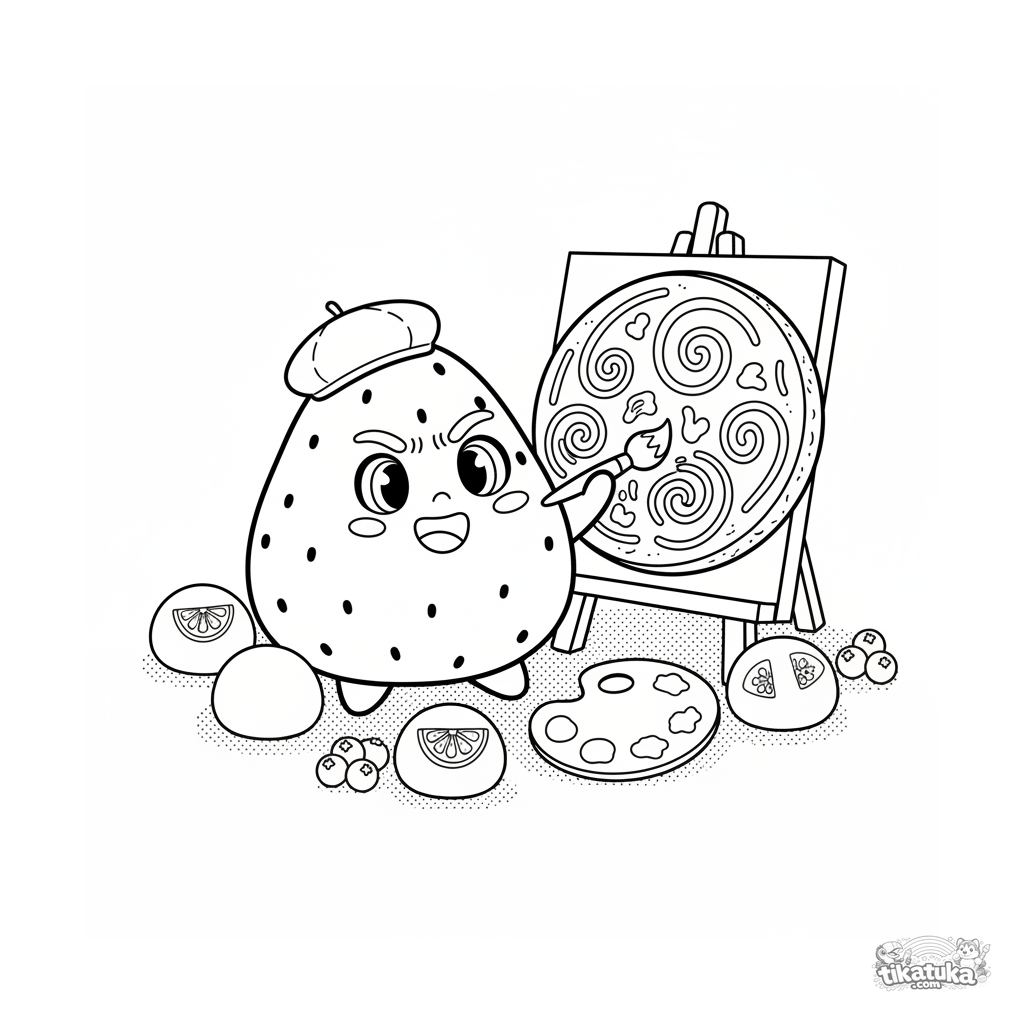 Сложная раскраска для детей 10-12 лет: клубничный моти в берете художника рисует на холсте из рисового крекера. Много деталей для творческого раскрашивания.